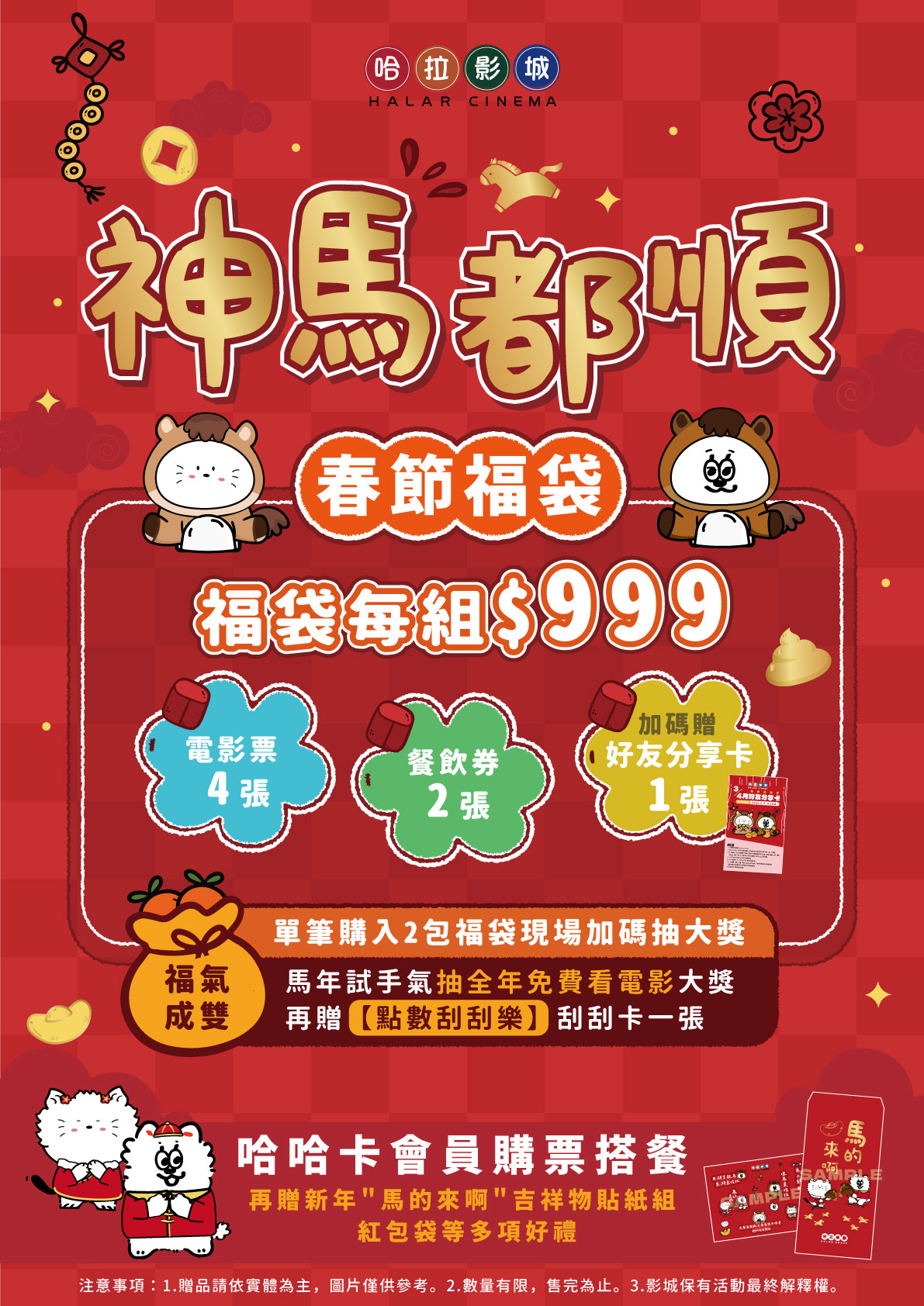 一、春節福袋2月5日開賣,數量有限,售完為止。 二、2月5日起哈哈卡會員購票時搭配餐點即贈新年哈哈東東吉祥物貼紙及紅包袋,數量有限,送完即止。